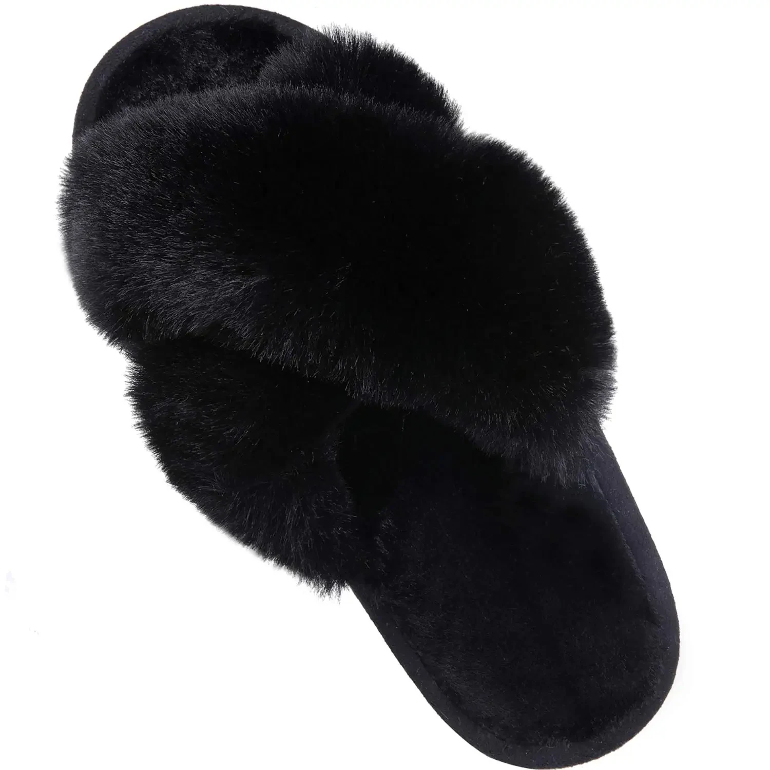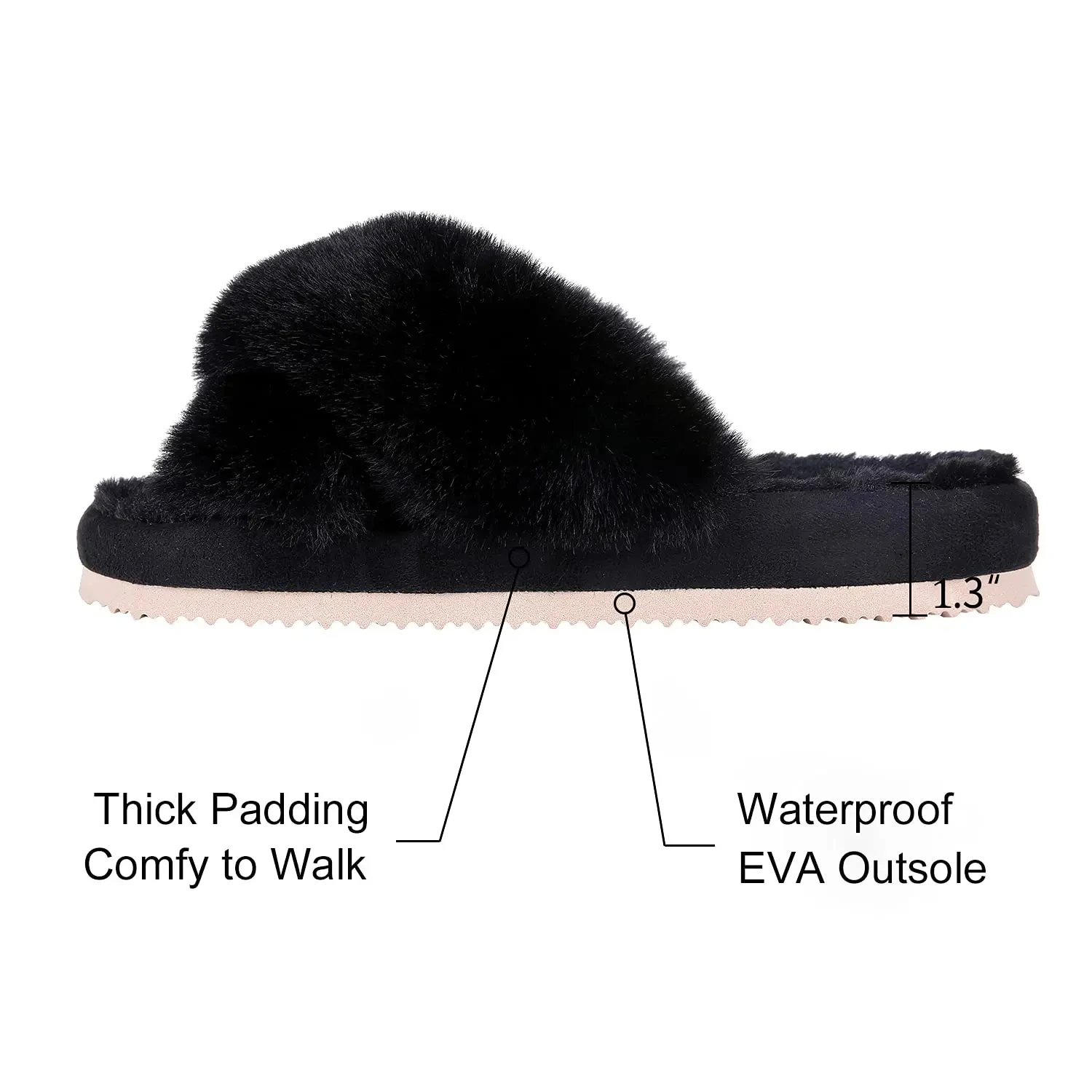 Comwarm Women's Cross Band Fuzzy Slippers Fluffy Open Toe House Slippers Cozy Plush Bedroom Shoes Indoor Outdoor Fur Sandals