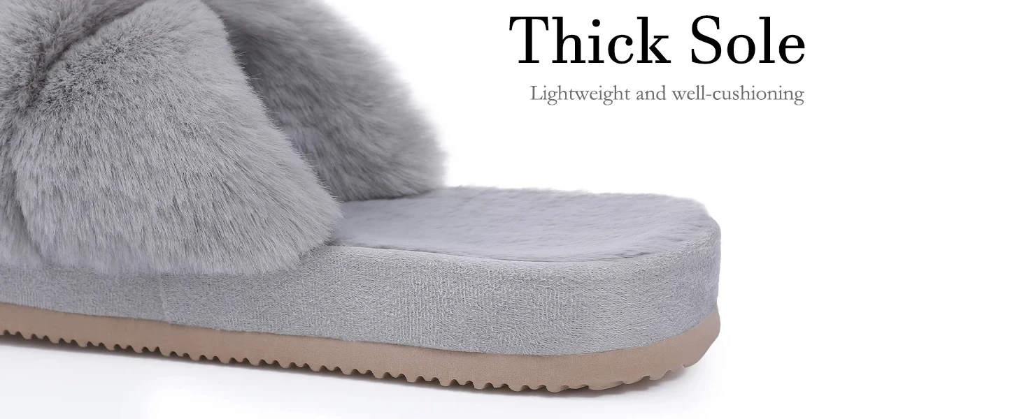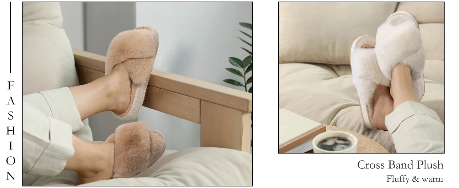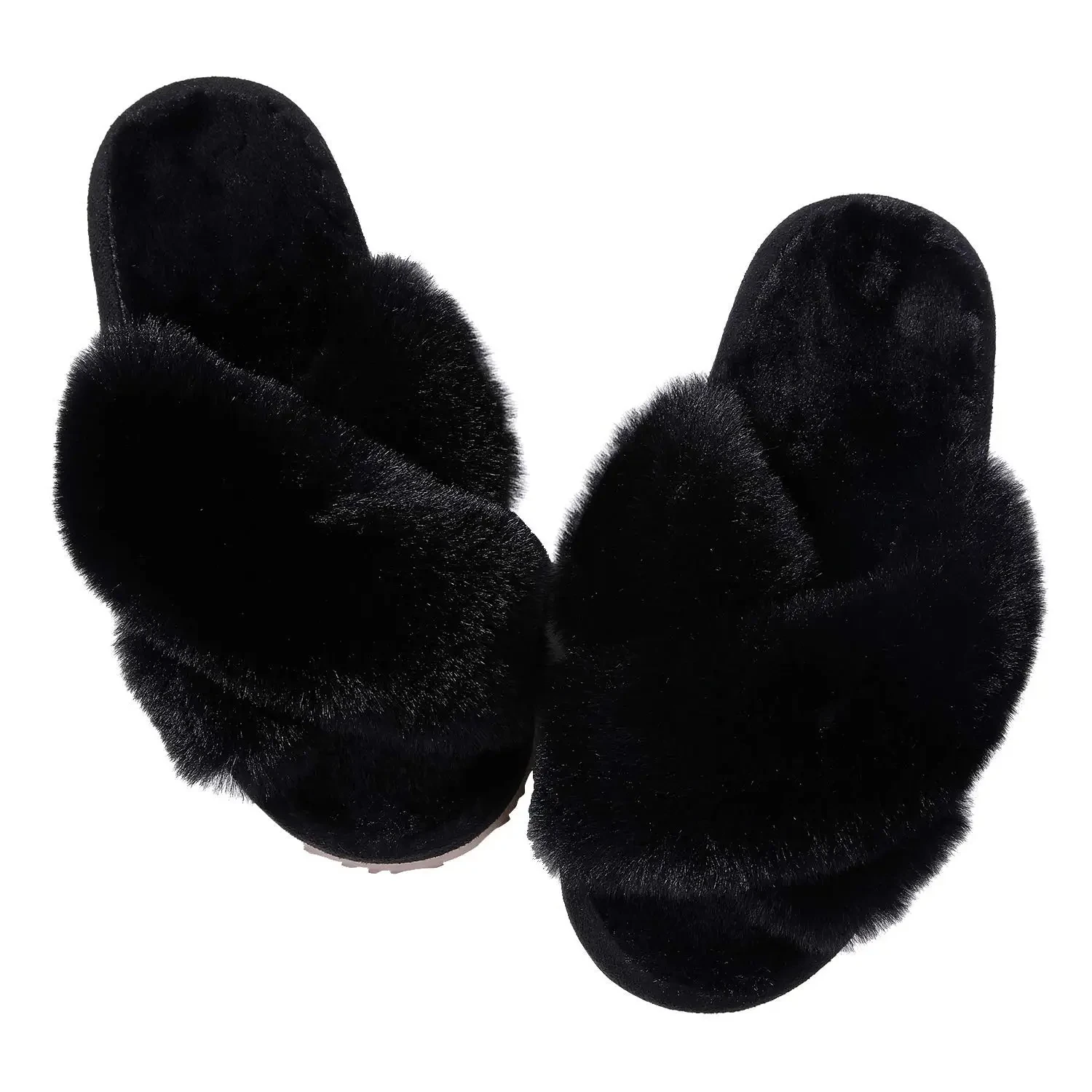"Comwarm Women's Cross-Band Fuzzy Slippers: Fluffy open-toe house slippers made of cozy plush material. Ideal for indoor and outdoor use as comfortable bedroom shoes or fur sandals."